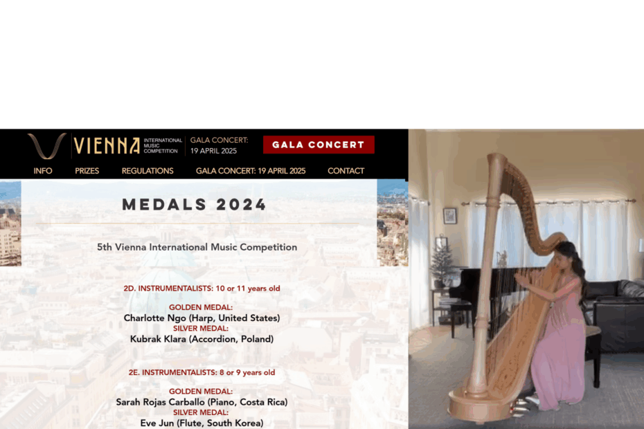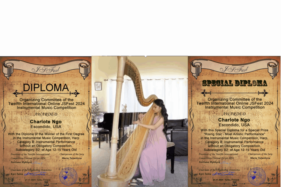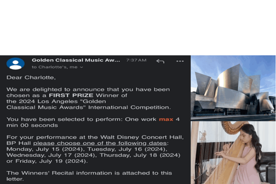 Charlotte Ngo continues to shine, earning a First Prize in the Golden Classical Music Awards International Competition. Her outstanding performance in the Golden Classical Music Awards has earned her the opportunity to perform at the famous Walt Disney Music Hall!