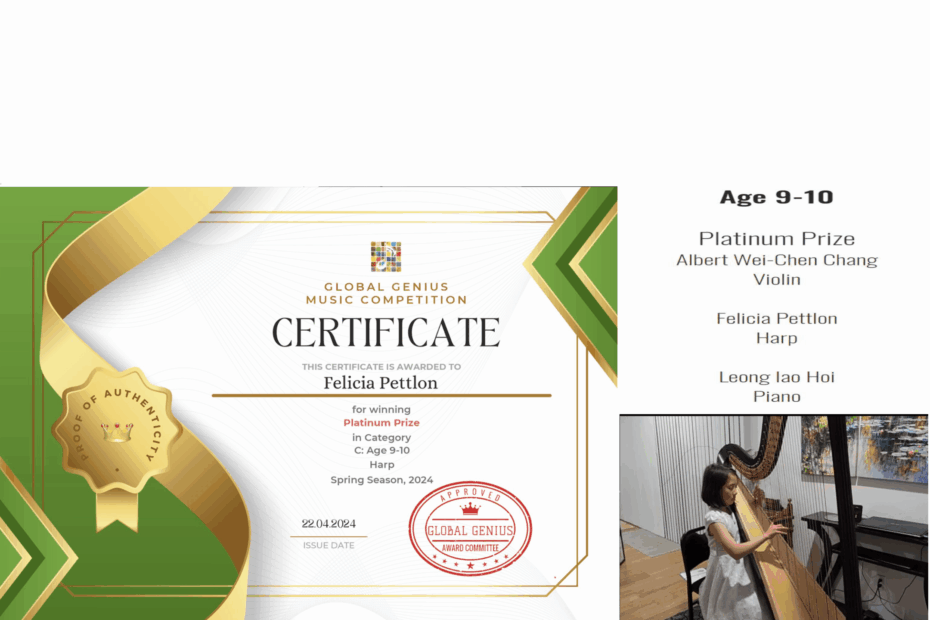 New victory in an international competition! My youngest student, Felicia Pettlon, won the Platinum Prize in the Global Genius Music Competition.